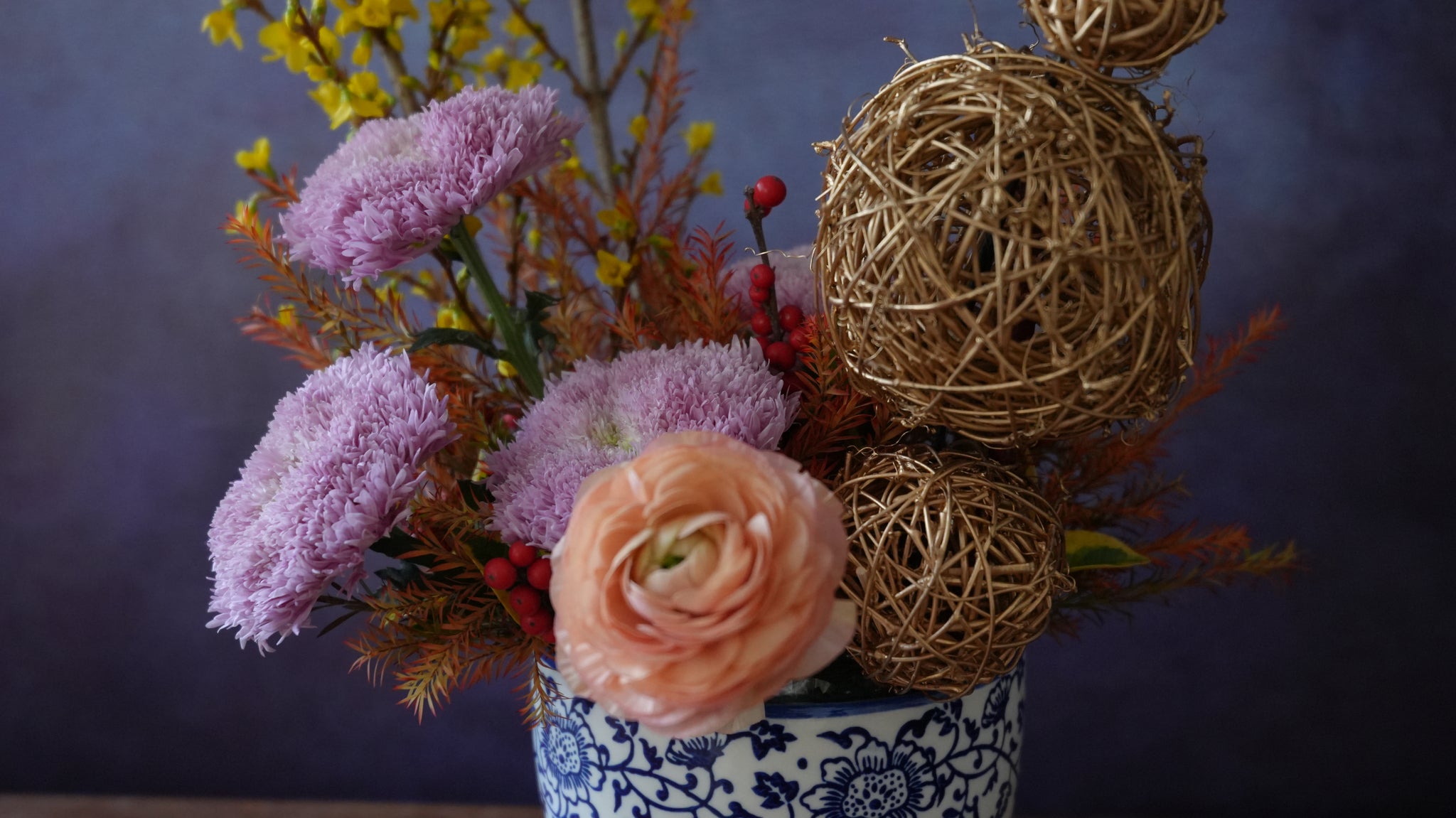 以璀璨的金黃為主調,串串金迎春花翩然起舞,襯以粉色菊花, 洋牡丹,金葉,展現百花齊放的春日榮景。手作藤編金球層層疊起,如山巒聚寶,寓意團圓美滿。 錦鯉吊飾悠遊其中,應合赤馬之年,得水潤澤,寓意諸事順遂、寄託富貴吉祥的新春賀願。